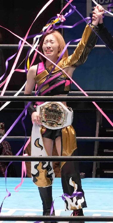 トレモロクラッチ」でキクをフォール。自力初勝利を得た。